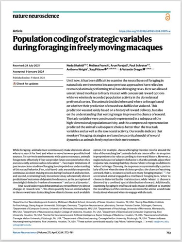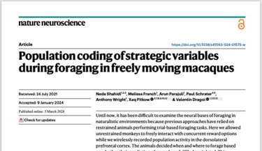 on the understanding that waiting longer improves the chance of reward. The task variables were continuously represented in a subspace of the high-dimensional population activity, and this compressed representation predicted the animal’s subsequent choices better than the true task variables and as well as the raw neural activity. Our results indicate that monkeys’ foraging strategies are based on a cortical model of reward dynamics as animals freely explore their environment.