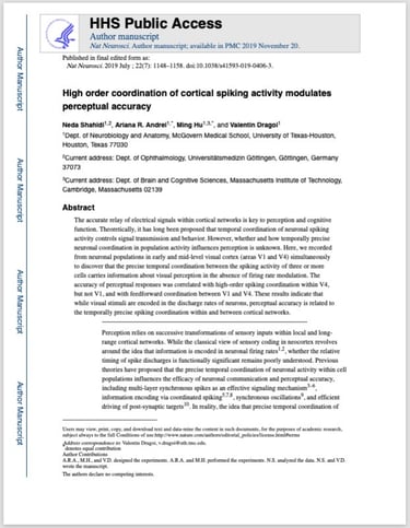 The accurate relay of electrical signals within cortical networks is key to perception and cognitive function. Theoretically, it has long been proposed that temporal coordination of neuronal spiking activity controls signal transmission and behavior. However, whether and how temporally precise neuronal coordination in population activity influences perception is unknown. Here, we recorded from neuronal populations in early and mid-level visual cortex (areas V1 and V4) simultaneously to discover that the precise temporal coordination between the spiking activity of three or more cells carries information about visual perception in the absence of firing rate modulation. The accuracy of perceptual responses was correlated with high-order spiking coordination within V4, but not V1, and with feedforward coordination between V1 and V4. These results indicate that while visual stimuli are encoded in the discharge rates of neurons, perceptual accuracy is related to the temporally precise spiking coordination within and between cortical networks.