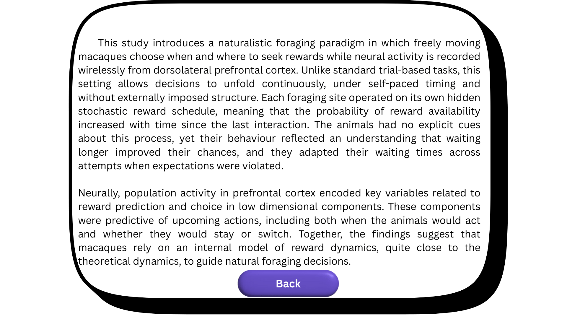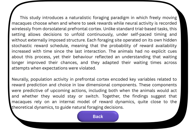 To study embodied choices, we record activity from the brain while tracking the body in naturalistic settings. This leaves us with enormous amounts of data, which we make sense of using computational models.
